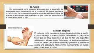 El documento describe el pulso desde el punto de vista médico. Define el pulso como la pulsación provocada por la expansión de las arterias debido a la circulación de sangre bombeada por el corazón. Explica cómo medir el pulso manualmente y los puntos comunes como las muñecas, el cuello y la sien. También discute factores que afectan el pulso como la edad, ejercicio y ambiente.