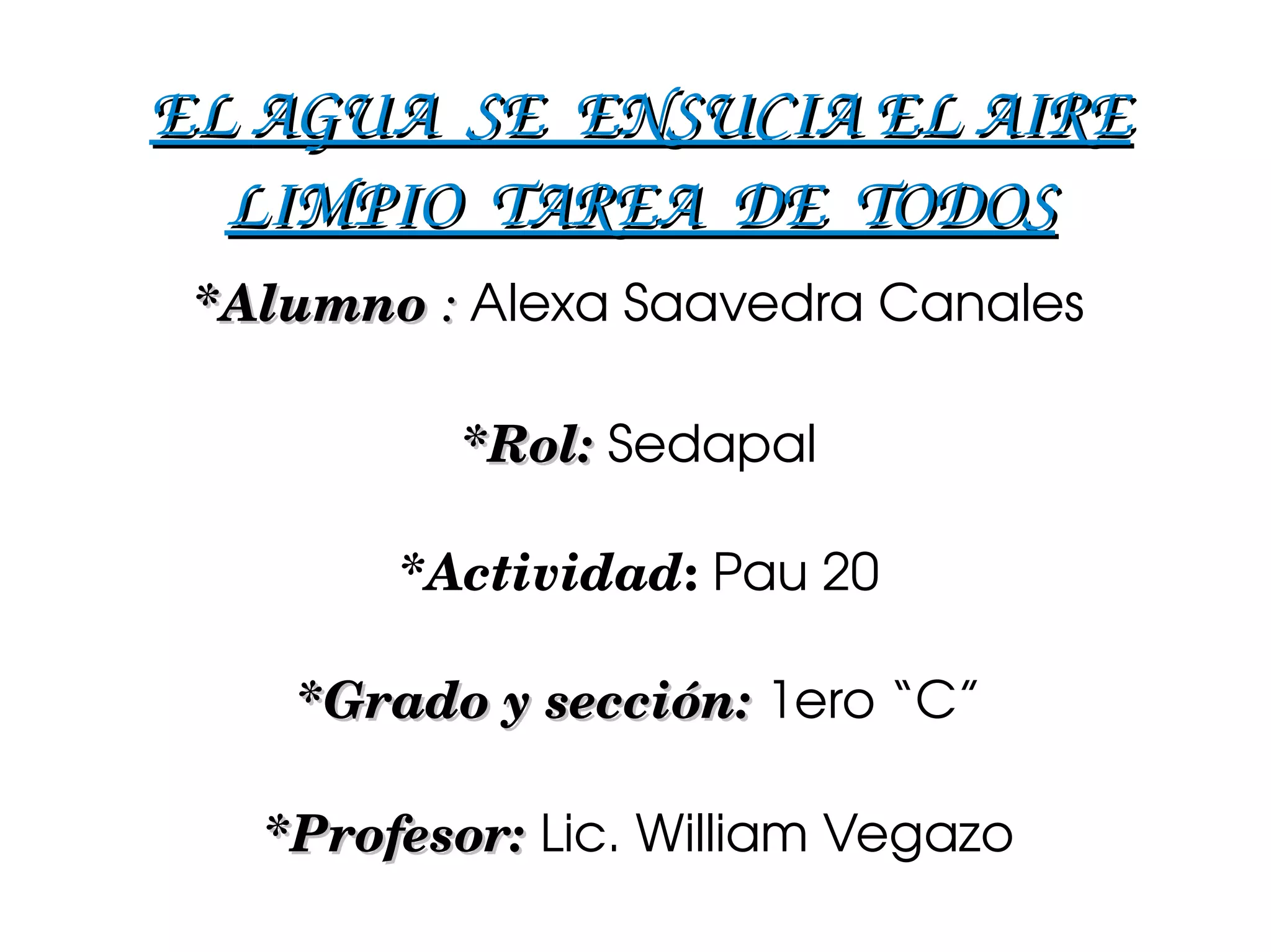 El documento habla sobre la contaminación del agua y el aire, y cómo es responsabilidad de todos ayudar a mantenerlos limpios. Una alumna llamada Alexa Saavedra Canales presentó un proyecto escolar sobre este tema para su clase de primer grado con el profesor William Vegazo.