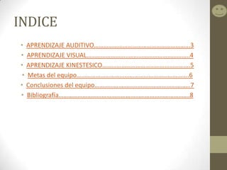 Este documento describe tres estilos de aprendizaje: auditivo, visual y kinestésico. Explica las técnicas de cada estilo, como escuchar música para el aprendizaje auditivo, usar mapas conceptuales para el visual, y practicar movimientos corporales para el kinestésico. Luego, resume las conclusiones del equipo de que sienten que el estilo kinestésico les resulta más fácil porque involucra la práctica física en lugar de solo ver u oír. El documento termina con una bibliografía de tres enlaces.