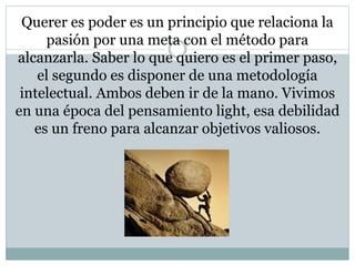 El documento habla sobre la relación entre querer y poder, y cómo la concentración y voluntad son factores clave para lograr objetivos. Explica que saber lo que se quiere es el primer paso, y tener una metodología intelectual es el segundo. También menciona que la motivación, voluntad y felicidad son factores principales para tener una buena vida y éxito.