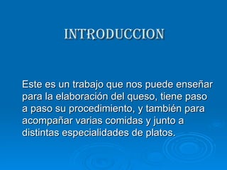Este documento proporciona instrucciones paso a paso para hacer queso casero. Explica que el queso se hace calentando la leche a fuego lento y agregando mantequilla, limón y vinagre para cortar la leche. Luego, el cuajo se cuela y se prensa para escurrir el suero, antes de enmoldearlo y madurarlo en el refrigerador.