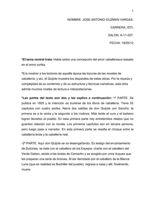 El documento resume el contenido y las ideas principales de la novela Don Quijote de la Mancha de Cervantes. Explica que la obra critica los libros de caballería medievales y cuenta las aventuras de Don Quijote y Sancho Panza. Además, destaca que la novela es rica y compleja en su estructura y que ha influido en otras obras literarias y artísticas.