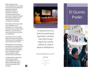 Las megaempresas de comunicación se han convertido en los principales actores de la globalización liberal al formar grandes grupos mediáticos a nivel mundial. Esto ha debilitado la capacidad de los medios para actuar como un contrapeso al poder, dando lugar a la necesidad de crear un "quinto poder" que permita a los ciudadanos oponerse a esta nueva coalición dominante formada por grandes corporaciones globales.