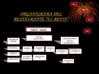 El documento proporciona información sobre un restaurante-bar llamado El Refin. Según las encuestas realizadas, el restaurante ofrecerá comida mexicana en la Plaza Veleros y contará con música. El documento también describe los puestos y horarios del personal, el menú, los trámites requeridos y consideraciones operativas como mercadotecnia y facturación. Adicionalmente, se incluye información sobre la red de telecomunicaciones instalada en el restaurante.