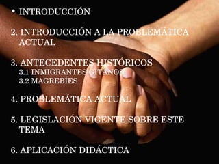 El documento trata sobre el tema del racismo. Explica la definición de racismo, sus antecedentes históricos con respecto a inmigrantes gitanos y magrebíes, la problemática actual del racismo incluyendo el sistema legal y el trabajo, y la legislación vigente sobre este tema así como esfuerzos de la comunidad global para combatir el racismo.