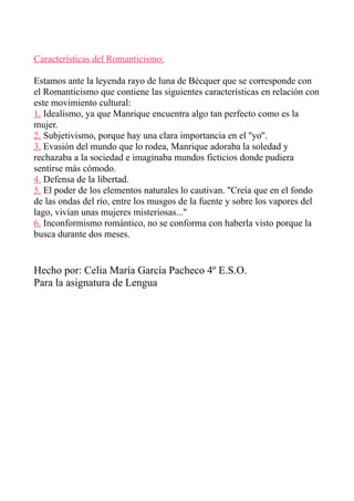Este documento presenta un resumen de la leyenda "El rayo de luna" de Gustavo Adolfo Bécquer. Cuenta la historia de Manrique, un noble solitario que una noche ve a una mujer perfecta junto a las ruinas de Soria. La persigue pero ella desaparece. La busca durante dos meses hasta que vuelve a verla bajo un rayo de luna, solo para que desaparezca de nuevo. Años más tarde, Manrique compara el amor fugaz a un rayo de luna.