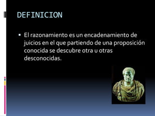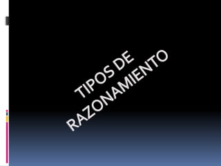 Este documento define el razonamiento como un encadenamiento de juicios que parte de una proposición conocida para descubrir otra u otras desconocidas. Explica que existen dos tipos de razonamiento: deductivo e inductivo. El razonamiento deductivo deriva conclusiones necesariamente verdaderas de premisas verdaderas, mientras que el inductivo obtiene conclusiones generales probables a partir de datos particulares. Finalmente, concluye que el razonamiento lógico es importante para expresarnos mejor y sacar nuestras propias conclusiones en el rol