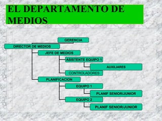 El documento describe la estructura y funciones de un departamento de medios de una agencia de publicidad. Detalla la jerarquía del departamento con un Director de Medios a cargo de Jefes de Medios y Planificadores. También explica las funciones de cada rol y los procesos involucrados en la planificación, compra y seguimiento de espacios publicitarios en diferentes medios.