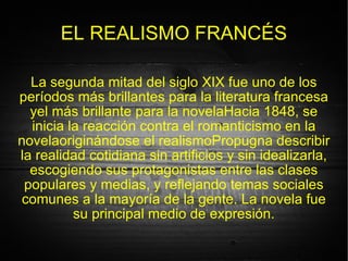 El documento describe el realismo francés como un movimiento literario de mediados del siglo XIX que buscaba describir la realidad cotidiana sin idealizaciones, reflejando temas sociales de las clases populares y medias. Autores representativos incluyen a Balzac, Stendhal, Flaubert, Maupassant y Zola, quien llevó el realismo hacia el naturalismo con una descripción más cruda y basada en la herencia y el ambiente. El realismo marcó el auge de la novela como género literario dominante.