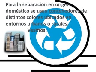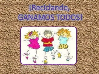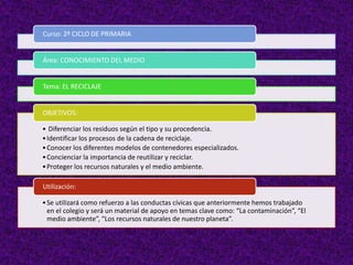 Este documento habla sobre un curso de 2o ciclo de primaria sobre el reciclaje. Los objetivos son diferenciar los residuos por tipo y procedencia, identificar los procesos de la cadena de reciclaje, conocer los contenedores especializados, y concientizar sobre la importancia de reutilizar y reciclar para proteger los recursos naturales.