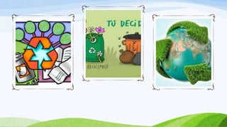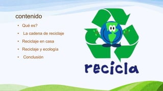 El documento explica qué es el reciclaje y su importancia para el medio ambiente. Define el reciclaje como someter materiales usados a procesos para obtener nuevas materias primas o productos. Describe la cadena de reciclaje y cómo funciona el reciclaje en casa y sus beneficios ecológicos como reducir residuos, preservar recursos y reducir costos de producción. Concluye enfatizando la necesidad de concientizarnos y practicar el reciclaje en todos los ámbitos para respetar el medio ambiente.