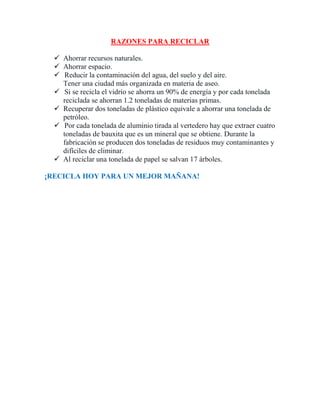 El documento define el reciclaje como aprovechar los residuos sólidos para transformarlos en materia prima y fabricar nuevos productos. Explica que el reciclaje permite volver a utilizar materiales y elementos usados para generar progreso y bienestar para la comunidad. Lista varios beneficios del reciclaje como proteger empleos, reducir la necesidad de vertederos, ahorrar energía y recursos naturales, y ayudar a proteger el medio ambiente para las futuras generaciones.