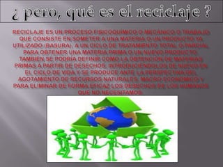 El documento describe las tres erres de la reducción de residuos: reducir, reutilizar y reciclar. Reduce significa reducir la producción de objetos que se convertirán en residuos, reutilizar significa darle una segunda vida a un producto ya sea con el mismo uso u otro diferente, y reciclar significa recoger y procesar los residuos para volver a introducirlos en el ciclo de vida. También menciona ejemplos como reutilizar latas de café y separar la basura en orgánica e inorgánica.