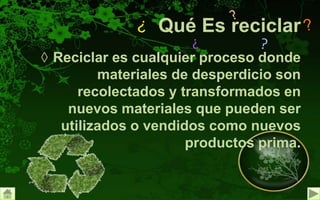 El reciclaje es el proceso de recolectar y transformar materiales de desecho en nuevos materiales que pueden ser utilizados o vendidos. Tiene beneficios ecológicos al reducir la basura en vertederos, beneficios económicos al proveer materia prima a industrias y generar empleos, y beneficios sociales al involucrar mano de obra. Los materiales se separan en contenedores de colores y se procesan en plantas de reciclaje para volver a usarse.
