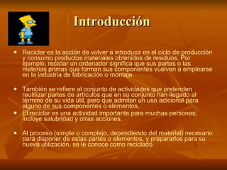 El documento habla sobre el reciclaje. Explica que el reciclaje involucra volver a introducir productos obtenidos de residuos en el ciclo de producción y consumo. Menciona algunos objetos que se pueden reciclar como plástico, metales, papel, vidrio y otros. También indica algunos derivados que se pueden obtener de materiales reciclados como laminas plásticas, embases y fibra de poliéster. Por último, lista algunas recicladoras ubicadas en la zona de San Martín.