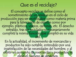 El documento habla sobre el reciclaje. Explica que el reciclaje implica someter residuos al ciclo de producción para ser reutilizados como materia prima para nuevos objetos. Luego describe los procesos de reciclaje para vidrio, papel y plástico. El vidrio puede ser reutilizado fácilmente creando envases idénticos. El reciclaje de papel reduce la tala de árboles. El reciclaje de plástico es difícil debido a la gran variedad de tipos de plástico y mezclas