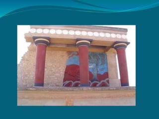 El documento resume la historia y características del Palacio de Cnosos en Creta. El palacio, construido alrededor de un gran patio rectangular, tenía más de 1,500 habitaciones y fue el centro político y administrativo de la antigua civilización minoica. Los minoicos se destacaron por su arquitectura, pinturas, escultura y cerámica, como se evidencia en los frescos y artefactos aún visibles en el palacio.