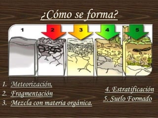 Este documento trata sobre la situación del recurso suelo en Perú. Explica que el suelo se forma a través de procesos de meteorización mecánica, química y biológica influenciados por factores como el material mineral, clima, relieve y organismos vivos. Describe los tipos de suelos agrícolas en Perú y los problemas de erosión, pérdida de fertilidad y contaminación que enfrentan, especialmente en la región de Ayacucho. Resalta la importancia de aplicar técnicas de conservación de suel