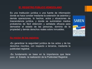 El documento describe el Registro Público Venezolano. Explica que es una institución jurídica que hace constar actos y situaciones de trascendencia jurídica mediante asientos. Su misión es garantizar la seguridad jurídica de los actos inscritos con respecto a terceros a través de la publicidad registral. Se organiza a través de oficinas principales y subalternas en las capitales de estados y municipios respectivamente. Los registradores públicos deben ser venezolanos mayores de 25 años con conocimiento de materias registrales