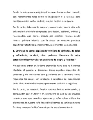 Este documento explora varias técnicas de meditación y estados alterados de conciencia como el reino de Dios, el Nirvana y el maya. A través de la meditación, algunas personas han logrado un estado de paz interior y comunión con lo divino. Sin embargo, pocos logran esto a través de cambiar sus esquemas cognitivos y afectivos. El documento también discute cómo liberarnos del sufrimiento a través del perdón y la aceptación, y cómo alcanzar la libertad personal mediante el cambio de nuestros esquemas