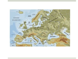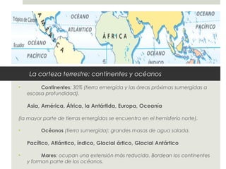 El documento describe las principales formas de relieve en la superficie terrestre como montañas, llanuras, mesetas y valles, y explica cómo se forman a través de fuerzas internas como movimientos de placas tectónicas y volcanes, y agentes externos como el viento, lluvia y erosión. También analiza las aguas continentales como ríos, glaciares, lagos y los riesgos naturales como terremotos y erupciones volcánicas.