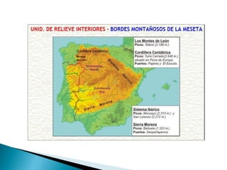 España tiene un relieve muy montañoso, con una gran meseta central rodeada de montañas como los Montes de León, la Cordillera Cantábrica y el Sistema Ibérico. Las costas son generalmente rectas y acantiladas, excepto en Galicia. Los archipiélagos de las Canarias y Baleares también tienen un relieve montañoso. Otras características notables incluyen las depresiones del Ebro y Guadalquivir, y las ciudades autónomas de Ceuta y Melilla con relieves ligeramente montañoso