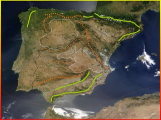El relieve de España es el resultado del choque de las placas tectónicas euroasiática y africana. Está formado por varias cadenas montañosas como los Sistemas Central e Ibérico, la Cordillera Cantábrica, los Pirineos y los Sistemas Béticos, separadas por mesetas como la Meseta Norte, Sur y depresiones como la del Ebro y Guadalquivir.