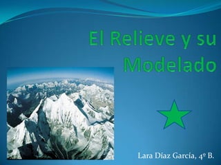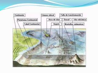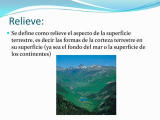 El documento describe los diferentes tipos de relieves de la corteza terrestre, incluyendo relieves oceánicos como dorsales oceánicas, fosas oceánicas y arcos de islas, y relieves continentales como penillanuras, cordilleras y plataformas continentales. También explica los procesos de meteorización mecánica y química que modelan la superficie terrestre, como la gelifracción, termoclastia y carbonatación, y los ambientes sedimentarios como fluviales, glaciares y marinos.