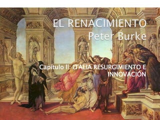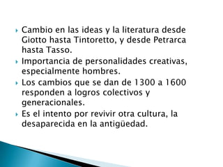 El documento resume los principales logros del Renacimiento italiano entre 1300 y 1600, incluyendo avances en arquitectura, escultura, pintura y literatura. Destaca a figuras influyentes como Brunelleschi, Bramante y Palladio en arquitectura, y Miguel Ángel en escultura. También describe el resurgimiento del interés en las formas clásicas, la perspectiva en la pintura y el humanismo.