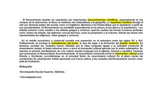 El Renacimiento fue un movimiento cultural, económico y social que se produjo en Europa entre los siglos XIV y XVI, en el que se rescató la cultura clásica de Grecia y Roma y se puso al hombre en el centro. Se caracterizó por un enfoque racional, individualista y hedonista, y por avances científicos y tecnológicos impulsados por mecenas.