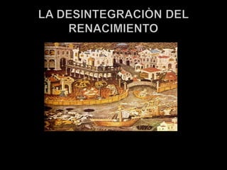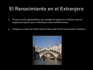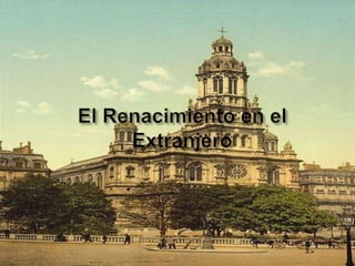 El documento detalla el impacto del Renacimiento en Europa, destacando la innovación artística y cultural en Italia, los Países Bajos y Francia. Se mencionan figuras clave como Jan van Eyck, Roger van der Weyden, Miguel Ángel y Shakespeare, resaltando sus contribuciones y obras emblemáticas. También se exploran las razones migratorias de humanistas italianos hacia otros países europeos, incluyendo exilios políticos y religiosos.