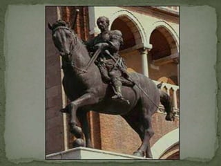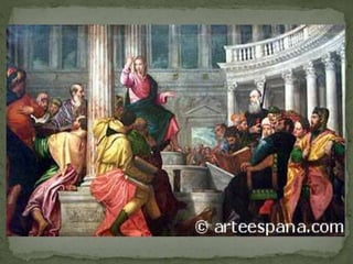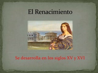 El documento presenta información sobre el Renacimiento en Europa entre los siglos XV y XVI. Se describe el Renacimiento como un movimiento ideológico, artístico y literario que se originó en Italia y se difundió por Europa, caracterizado por la recuperación de logros de la antigüedad clásica. Se resumen las principales características políticas, sociales, económicas, religiosas y filosóficas de este periodo, así como los desarrollos en pintura, escultura y arquitectura.