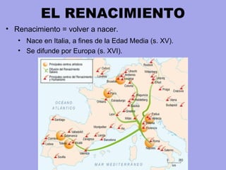El documento resume las características principales del Renacimiento en Europa. Se originó en Italia en el siglo XV y se difundió por el continente en el siglo XVI, promoviendo un espíritu humanista basado en el individualismo y el esfuerzo personal. Los grandes artistas de la época como Leonardo, Miguel Ángel y Rafael crearon obras maestras inspiradas en los cánones clásicos que mostraban belleza ideal y perfección anatómica. El mecenazgo de la Iglesia y la nobleza impulsó el desarrol
