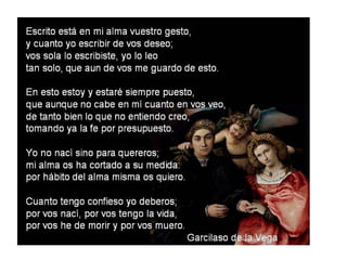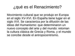El documento trata sobre el Renacimiento y la poesía renacentista. El Renacimiento fue un movimiento cultural que se produjo en Europa entre los siglos XV y XVI, caracterizado por la difusión de las ideas humanistas que promovieron un nuevo concepto del arte y del mundo basado en la cultura clásica de Grecia y Roma. La poesía renacentista abordaba temas como el amor, la belleza femenina y la naturaleza, y se caracterizaba por el uso de sonetos, églogas y descripciones detalladas utilizando recursos como