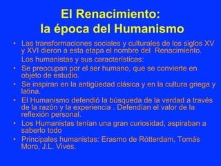 El documento describe el Renacimiento en Europa, un período histórico entre los siglos XV y XVI caracterizado por el renacimiento del interés en el humanismo, las artes y las ciencias. Los humanistas como Erasmo de Rótterdam y Tomás Moro enfatizaron la dignidad humana y la razón. Artistas como Miguel Ángel, Leonardo da Vinci y Rafael revolucionaron la pintura y escultura con su maestría técnica y representaciones realistas del cuerpo humano. La arquitectura también floreció con nuevos estilos clásicos.
