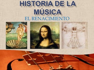 El documento describe la música del Renacimiento y las artes plásticas durante este período. La música del Renacimiento se caracterizó por el desarrollo de la polifonía coral, el establecimiento del coro como medio de expresión, y la aparición de nuevas formas musicales. Las artes plásticas florecieron durante este tiempo gracias al redescubrimiento de la antigüedad clásica, con artistas como Miguel Ángel y Leonardo da Vinci creando obras maestras. La clasificación de las voces también se desarroll