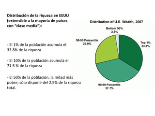 El documento analiza el creciente desequilibrio en la distribución de la riqueza y los ingresos a nivel mundial, con una mayor concentración en manos del 1% más rico. Se argumenta que reducir los impuestos a los ricos ha llevado a mayores desigualdades y crisis económicas. Se sugiere que elevar nuevamente las tasas impositivas marginales podría generar una sociedad más equitativa y estable a largo plazo.