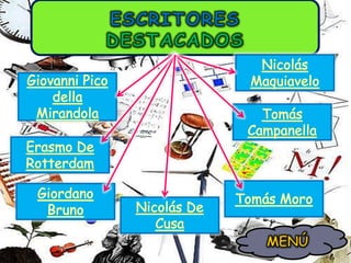El documento aborda el Renacimiento, un período clave en la historia que marcó la transición del mundo medieval al humanismo y el mundo moderno, destacando el renacer del individuo y la cultura en diversas disciplinas. Examina la influencia de pensadores como Nicolás de Cusa, Maquiavelo y Galileo, quienes contribuyeron a un cambio ideológico que favoreció la ciencia y el crecimiento económico, desafiando antiguas creencias y la concepción de la naturaleza humana. Se enfatiza la idea de que el hombre se convierte en el centro del conocimiento y el arte, despegándose de la influencia divina a través de la observación y la práctica.