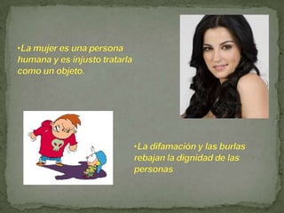 El documento habla sobre el respeto y cómo comienza desde uno mismo al valorar a los demás y considerar su dignidad. El respeto siempre se adhiere a la verdad y no tolera la mentira, calumnia o engaño. Para obtener respeto, se debe dar respeto primero y tratar a los demás con delicadeza.