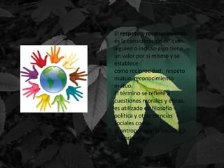 El documento habla sobre el respeto y su importancia. Define el respeto como la consideración del valor de alguien o algo, y cómo es necesario para relaciones efectivas entre personas a través de la confianza y responsabilidad. También discute cómo la falta de respeto surge de enfatizar demasiado la libertad individual sin responsabilidad, y cómo el respeto es una virtud moral que mantiene el equilibrio entre el miedo y el abuso.