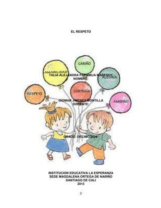 Este documento habla sobre el valor del respeto. Define el respeto como la consideración del valor inherente de una persona u objeto. Explica cómo ser respetuoso en la familia, la escuela y lugares públicos, incluyendo escuchar a los demás, seguir las reglas y no dañar a otros o la propiedad. También destaca la importancia del respeto para las actividades del SENA y cómo este valor contribuye a una vida positiva.