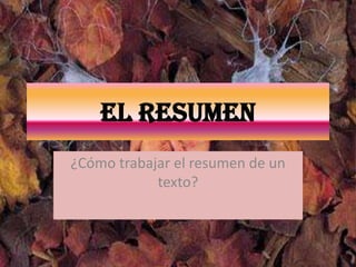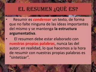 Este documento ofrece instrucciones para elaborar un resumen efectivo de un texto. Explica que un resumen debe condensar las ideas principales de manera concisa pero completa, utilizando nuestras propias palabras en lugar de las del autor. Además, recomienda leer y subrayar el texto original, elaborar un esquema de las ideas clave y relacionarlas de forma coherente en el resumen. Finalmente, señala que el resumen debe tener entre una quinta y una tercera parte de la longitud del texto, expresar las ideas de manera objetiva y