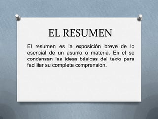Este documento explica cómo hacer un resumen efectivo y las ventajas de este proceso. Un resumen condensa las ideas principales de un texto de manera breve para facilitar la comprensión. Se recomienda subrayar y esquematizar el texto, luego usar precisión y conjunciones para enlazar ideas en el resumen. Algunas ventajas de hacer resúmenes son desarrollar la capacidad de síntesis, mejorar la expresión escrita y facilitar la concentración y memorización.