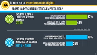 El documento analiza el impacto de la transformación digital en Colombia y cómo las empresas se están preparando ante la disrupción tecnológica. Se destaca la importancia de la adopción de tecnologías digitales y el acceso a internet como factores clave para la competitividad. Además, se presentan estadísticas sobre la digitalización y la relación entre el Estado y los ciudadanos mediante servicios digitales.