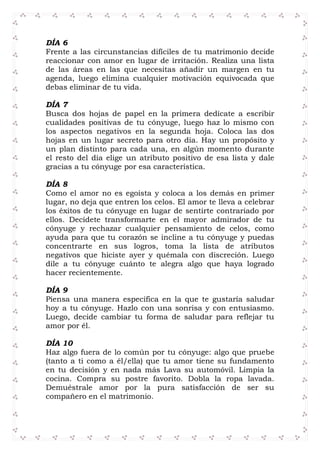 El documento presenta un desafío de 40 días para que los matrimonios practiquen el amor incondicional. Cada día propone una acción diferente como demostrar paciencia, hacer un gesto de amabilidad, comprar un regalo, orar juntos, perdonarse mutuamente, leer la Biblia y renovar los votos matrimoniales. El objetivo es que las parejas fortalezcan su relación a través del amor, la comprensión y el compromiso con Dios.