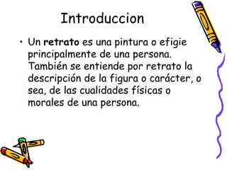 Este documento ofrece instrucciones para dibujar un retrato. Explica que primero se debe enmarcar la forma de la cabeza y verla como un espacio vacío rodeado por un espacio negativo. Luego, detalla cómo dibujar los ojos, la nariz, la boca y las orejas, enfocándose en las formas negativas entre las características. Finalmente, lista los materiales necesarios como lápices, gomas de borrar y soportes, y enfatiza la importancia de un trazo seguro y firme.