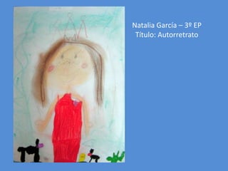 El documento presenta una lista de 14 retratos realizados por estudiantes de entre 4 y 5 años de edad y de 1o y 3o de Educación Primaria como parte de un curso extraescolar de dibujo y pintura. Cada entrada incluye el nombre del estudiante, su grado o edad y el título de la obra, la mayoría de los cuales son autorretratos o retratos de sus compañeros y profesores.