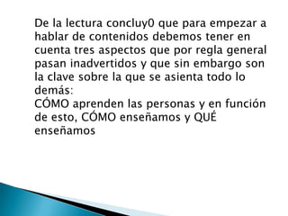 El documento discute tres aspectos clave del aprendizaje: cómo aprenden las personas (haciendo y no escuchando), cómo enseñar (dando oportunidades para pensar y experimentar en lugar de escuchar pasivamente), y qué enseñar (habilidades blandas como comunicación, trabajo en equipo, resolución de problemas). También destaca la importancia de la motivación, cometer errores, y hacer el aprendizaje divertido y conectado a experiencias del mundo real.