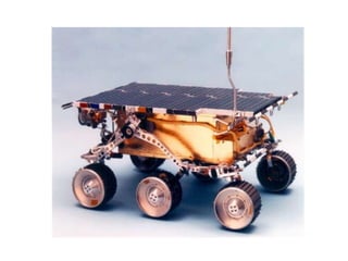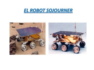El documento describe el robot Sojourner, el primer vehículo robótico en Marte. Sojourner pesaba 11 kg y tenía seis ruedas que le permitían moverse a 0.6 m/min. También describe la Mars Climate Orbiter, una sonda de la NASA cuyo objetivo era estudiar el clima de Marte pero que se destruyó debido a un error en las unidades de medida entre el equipo de control en la Tierra y la sonda.