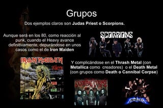 El heavy metal se caracteriza por ritmos potentes con guitarras distorsionadas, ritmos marcados de batería y bajos pesados. Judas Priest y Scorpions son ejemplos claros de este estilo. En los 80s, el heavy metal avanzó y se ramificó en subgéneros como el thrash metal de Metallica y el death metal con bandas como Death.